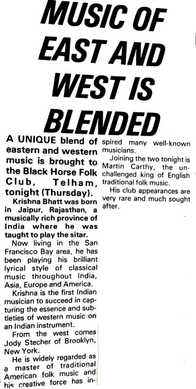 Krishna Bhatt and Jody Stecher – Black Horse Folk Club 1980 November 8, 2025 by Alan Esdaile Share this: Click to share on Facebook (Opens in new window) Facebook Click to share on X (Opens in new window) X Click to share on Tumblr (Opens in new window) Tumblr Click to share on Reddit (Opens in new window) Reddit More Click to email a link to a friend (Opens in new window) Email Click to print (Opens in new window) Print Click to share on LinkedIn (Opens in new window) LinkedIn Click to share on Pinterest (Opens in new window) Pinterest Click to share on Pocket (Opens in new window) Pocket
